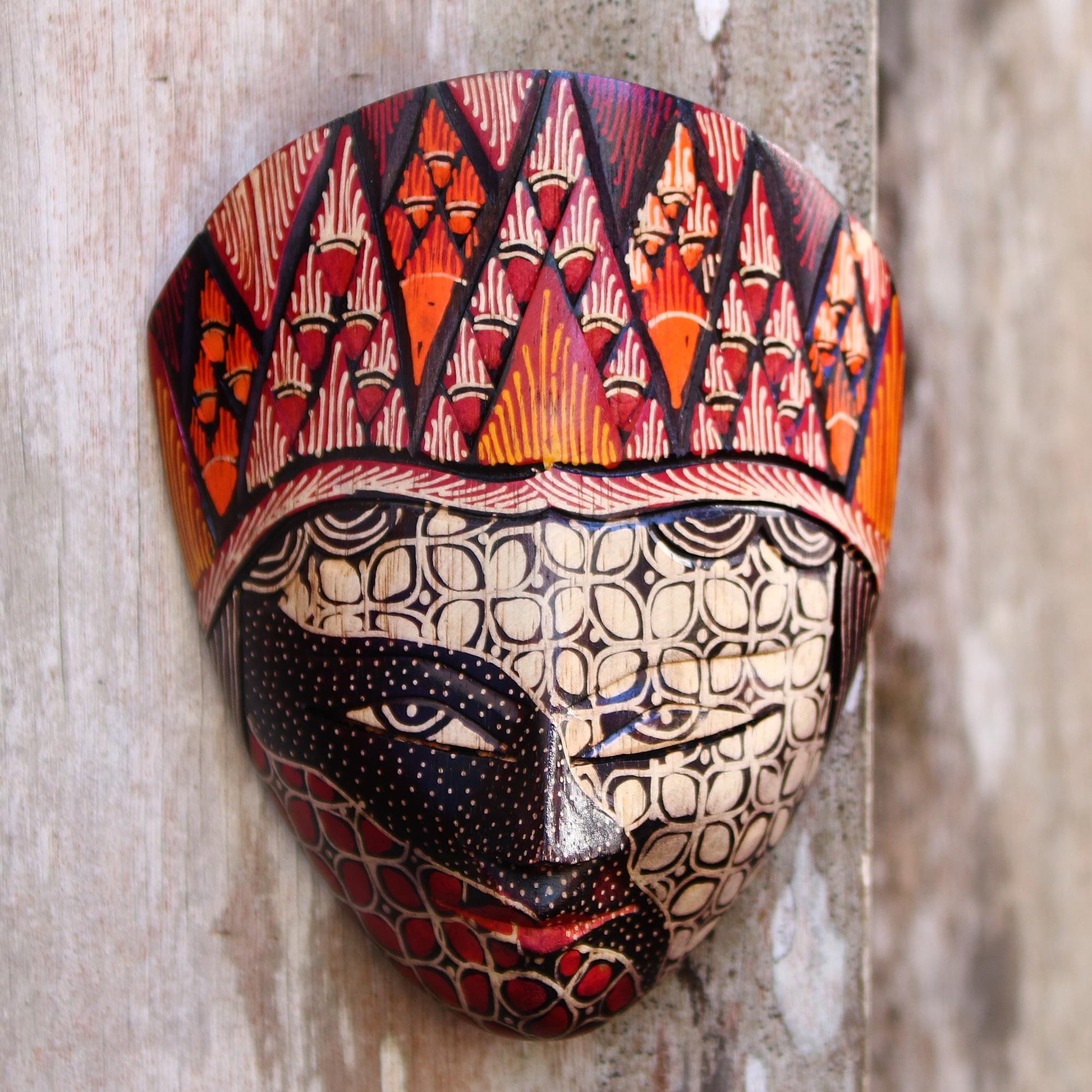 In tones of black, red, and orange, the face of a wise princess is decorated with luscious floral motifs. Javanese artisan Omi Setiawan crafts this mask from albesia wood, decorated using the batik method, where a wax resist is painted onto the surface before colorful dyes are applied. Traditional kawung motifs are visible on the mask's forehead, nose, and cheek.